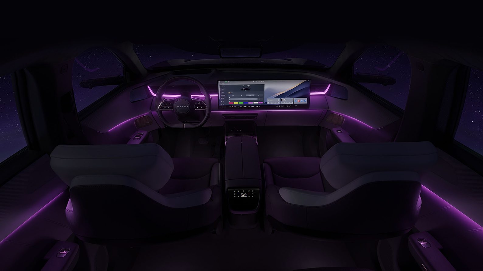 外观设计,马自达EZ-60延续了马自达"魂动"设计理念,封闭式格栅搭配分体式大灯、贯穿式日行灯以及可发光LOGO,极具未来感。侧面采用双色悬浮车顶设计,配合隐藏式门把手、无框车门,营造出一种动感且优雅的视觉效果。尾部采用了贯穿式尾灯设计,搭配下方双边共两出的排气布局,进一步增添了整车的动感氛围。