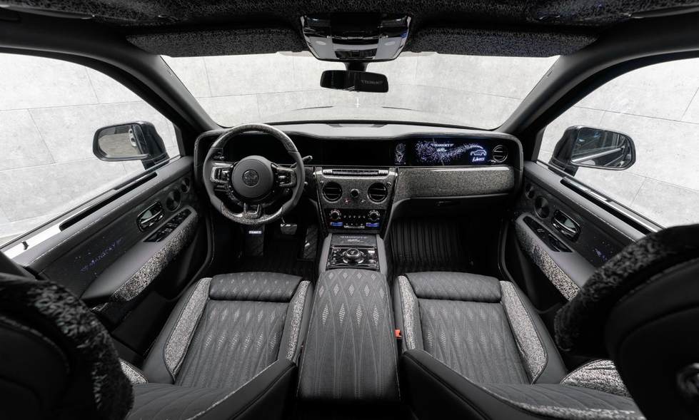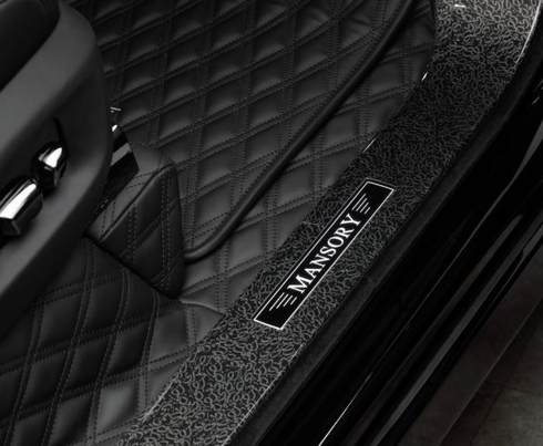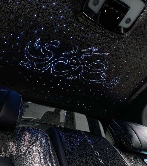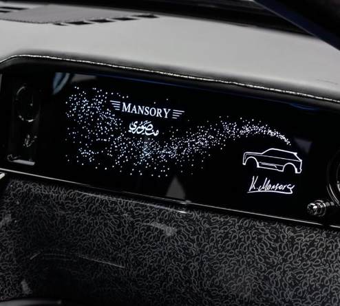除了外观,内饰也是迈莎锐重点改装的地方。这次他们为新车打造了类似阿拉伯风格的装饰元素,这一点为了与车名称相贴合。座椅靠背、头枕、仪表面板、车门迎宾踏板、安全带等处设计有MANSORY车标。改装后的内饰还配备了定制化星空顶,配有阿拉伯文样式,并且车门饰板上也有许多星光图案。由于车外采用银黑双色,所以内饰主色调进行了相搭。