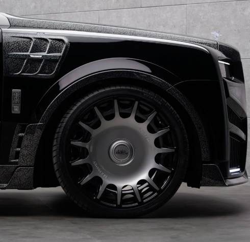 这款库里南依旧采用了迈莎锐常用的宽体套件风格,轮眉进行外扩,前杠配备了前唇,侧面搭配侧裙,尾部设计有夸张的空气扩散器,车头前杠上额外加装了LED日行灯使其与原厂日行灯形成矩形边框。车尾顶部与中部加装了尾翼,后杠配有夸张的空气扩散器,中央为双六边形排气口。新车采用全新轮毂样式,颜色为枪灰色,能很好的与车身颜色相搭配。