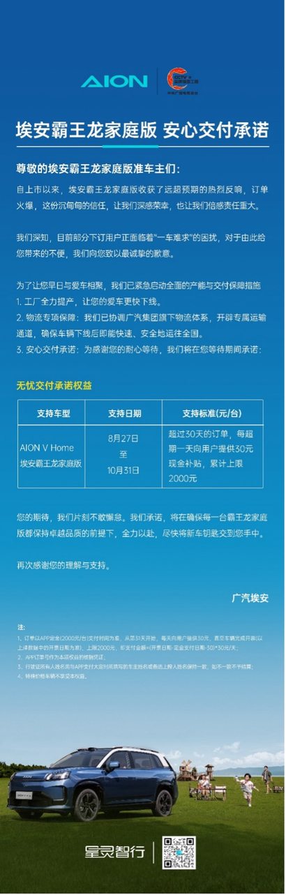 订单暴涨提车不久等 埃安霸王龙家庭版“安心交付”政策出台