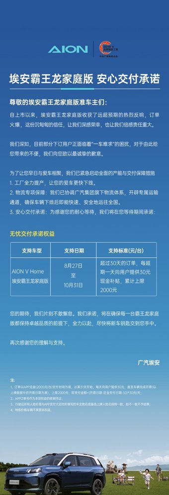 超期补贴!埃安霸王龙家庭版热销加推“安心交付”政策