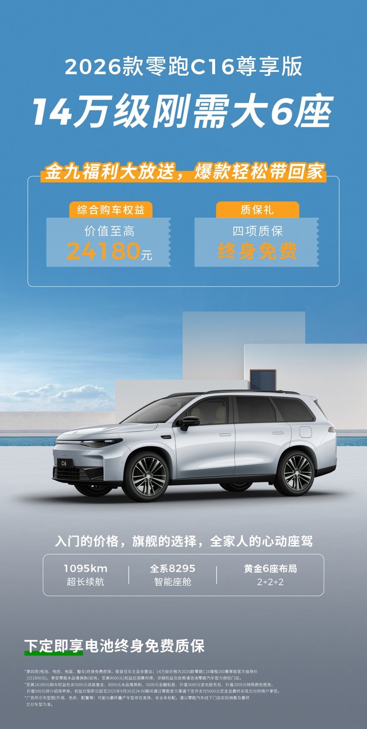 不过别着急,要是能稍微把预算往上提一点,情况就完全不一样了,最近零跑C16推出的十月限时优惠政策,就让14万多的预算能拿下全新6座SUV成为了可能。以零跑C16 2024款纯电580尊享版为例,这款车官方指导价17.28万,现在购车可享24810元的购车权益,算下来裸车价只要14.86万(因地区差异,具有优惠详情请咨询当地经销商),刚好比14万多一点,大多数家庭应该都能接受这个预算浮动。更实在的是,除了价格优惠,还送四项终身免费质保,这可是后期用车的重要保障,能省不少心。接下来就结合实际用车场景,跟大家好好聊聊这款零跑C16 580尊享版到底值不值得选。