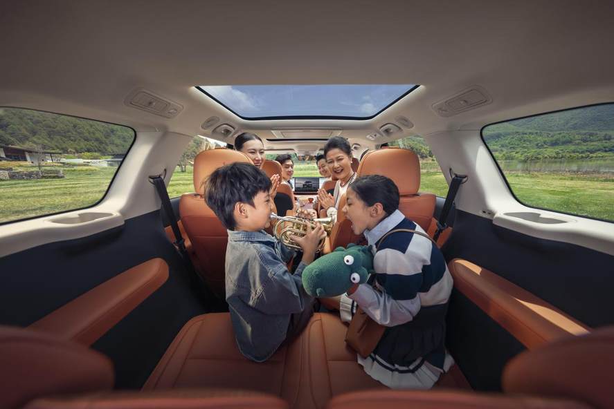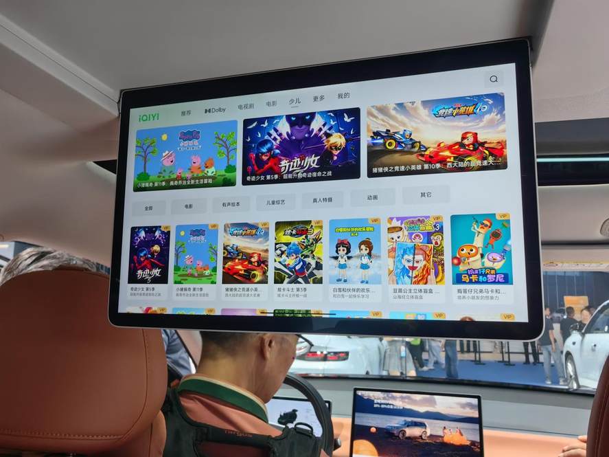 后排的15.6英寸吸顶屏(选装)也是一个带娃神器,我朋友家有个3岁的小孩,以前坐车总爱哭闹,自从坐了这款车,给他放个动画片,能安安静静待两个小时。第二排还配备有小桌板,小孩子的玩具可以随意摆放,大人要是有工作需要解决也能放下笔记本作为临时的工作台,主打一个实用。