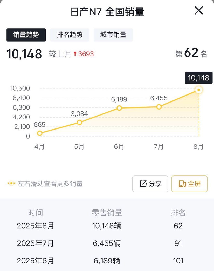 实际交付量同样亮眼:5月销量3034辆,6月猛增至6189辆,8月销量破万辆,位列合资新能源销量榜首。这一成绩让N7在10-15万中大型纯电轿车市场多周蝉联冠军,甚至超过了同级别的比亚迪汉EV、小鹏P7+等热门车型。