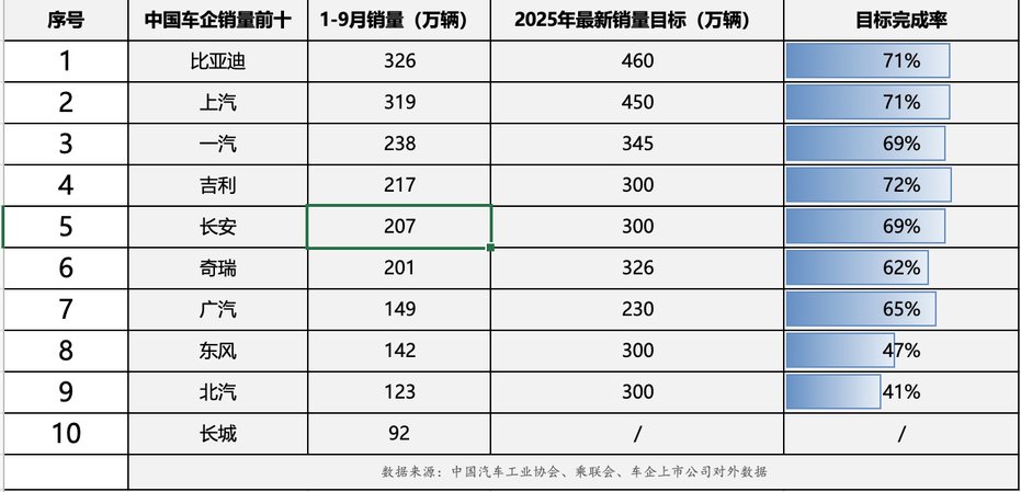从销量前十车企来看,多家车企销量目标达成率亮眼。比亚迪和上汽集团处于行业头部,1-9月累计销量均已超300万辆。其中,排名第一的比亚迪1-9月销量达326万辆,已完成全年460万辆最新销量目标的71%,持续巩固其无可撼动的领先地位。上汽集团同期销量达到319.3万辆,目标完成率同样为71%,在燃油与新能源双线并行下保持稳健态势。
