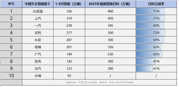 金九银十冲刺期:中国车企最新销量与目标完成率同步披露