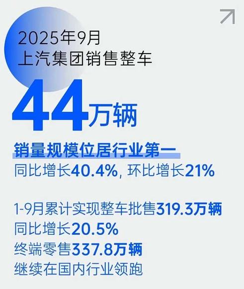 9月销售整车44万辆,同比增长40.4%,环比增长21%,销量规模位居行业第一;1-9月累计实现整车批售319.3万辆,同比增长20.5%,终端零售337.8万辆…… 上汽月销量实现同比“九连涨”的繁荣景象,与2024年的疲软状态形成强烈反差。