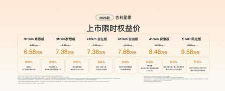 2026款吉利星愿上市限时权益价为6.58万元–9.58万元。同时为回馈用户支持,同步推出八重限时购车权益,包括焕新礼、宠粉礼、缤纷礼、选装礼、金融礼、流量礼、质保礼、补能礼,进一步降低拥车门槛,提升用车体验。