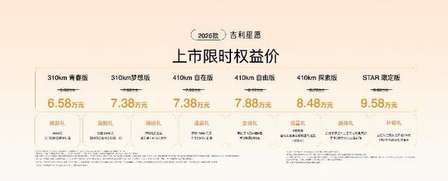 2026款吉利星愿上市限时权益价为6.58万元–9.58万元。同时为回馈用户支持,同步推出八重限时购车权益,包括焕新礼、宠粉礼、缤纷礼、选装礼、金融礼、流量礼、质保礼、补能礼,进一步降低拥车门槛,提升用车体验。