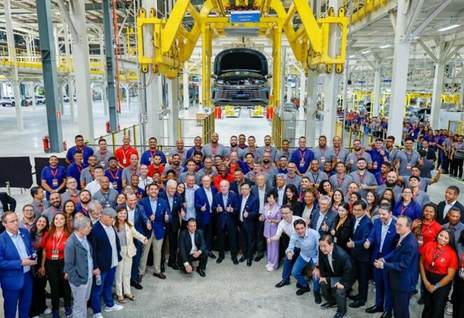 巴西总统卢拉、比亚迪董事长兼总裁王传福与比亚迪巴西卡马萨里工厂员工合影