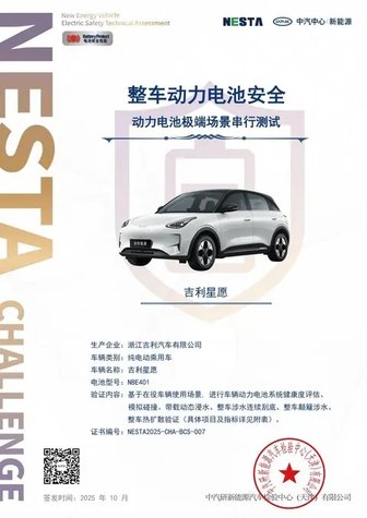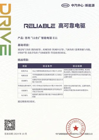 吉利星愿搭载行业首款11合1智能电驱,在功能高度集成的同时,还拥有同级领先的89.2%电驱效率,实现了同级最小的66L体积。通过了3000小时的台架耐久和200万公里的真实路试,星愿电驱完成了浸水工作、高温耐久、电磁抗扰、扭矩冲击、机械冲击等7大高难度挑战,获得了中汽研《高可靠电驱》的认证。