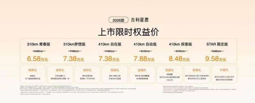 自去年10月上市以来,吉利星愿累计销量突破40万辆,今年9月单月销量超5万辆,稳居全品类车型冠军。吉利银河已收获145万用户,成为中国新能源最快突破百万销量的品牌。2026款星愿以八重限时权益(焕新礼、宠粉礼等)进一步降低拥车门槛,强化“现象级爆款”市场号召力。