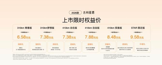 2026款吉利星愿上市限时权益价为6.58万元–9.58万元。同时为回馈用户支持,同步推出八重限时购车权益,包括焕新礼、宠粉礼、缤纷礼、选装礼、金融礼、流量礼、质保礼、补能礼,进一步降低拥车门槛,提升用车体验。