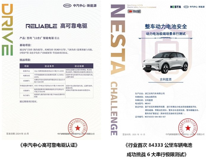 吉利星愿搭载行业首款11合1智能电驱,在功能高度集成的同时,还拥有同级领先的89.2%电驱效率,实现了同级最小的66L体积,将节省的空间以超大后备箱的形式还给了用户。通过了3000小时的台架耐久和200万公里的真实路试,星愿电驱完成了浸水工作、高温耐久、电磁抗扰、扭矩冲击、机械冲击等7大高难度挑战,获得了中汽研《高可靠电驱》的认证。