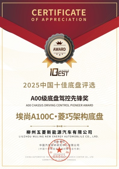 近日,2025中国十佳底盘评选结果重磅发布,引发行业广泛关注。柳州五菱新能源旗下埃尚A100C·菱巧架构底盘成功摘得“A00级底盘驾控先锋奖”。值得一提的是,A00级别车辆参与底盘比赛尚属首次,而埃尚A100C此次获奖,充分彰显了其在A00级细分市场中底盘技术的领先地位。