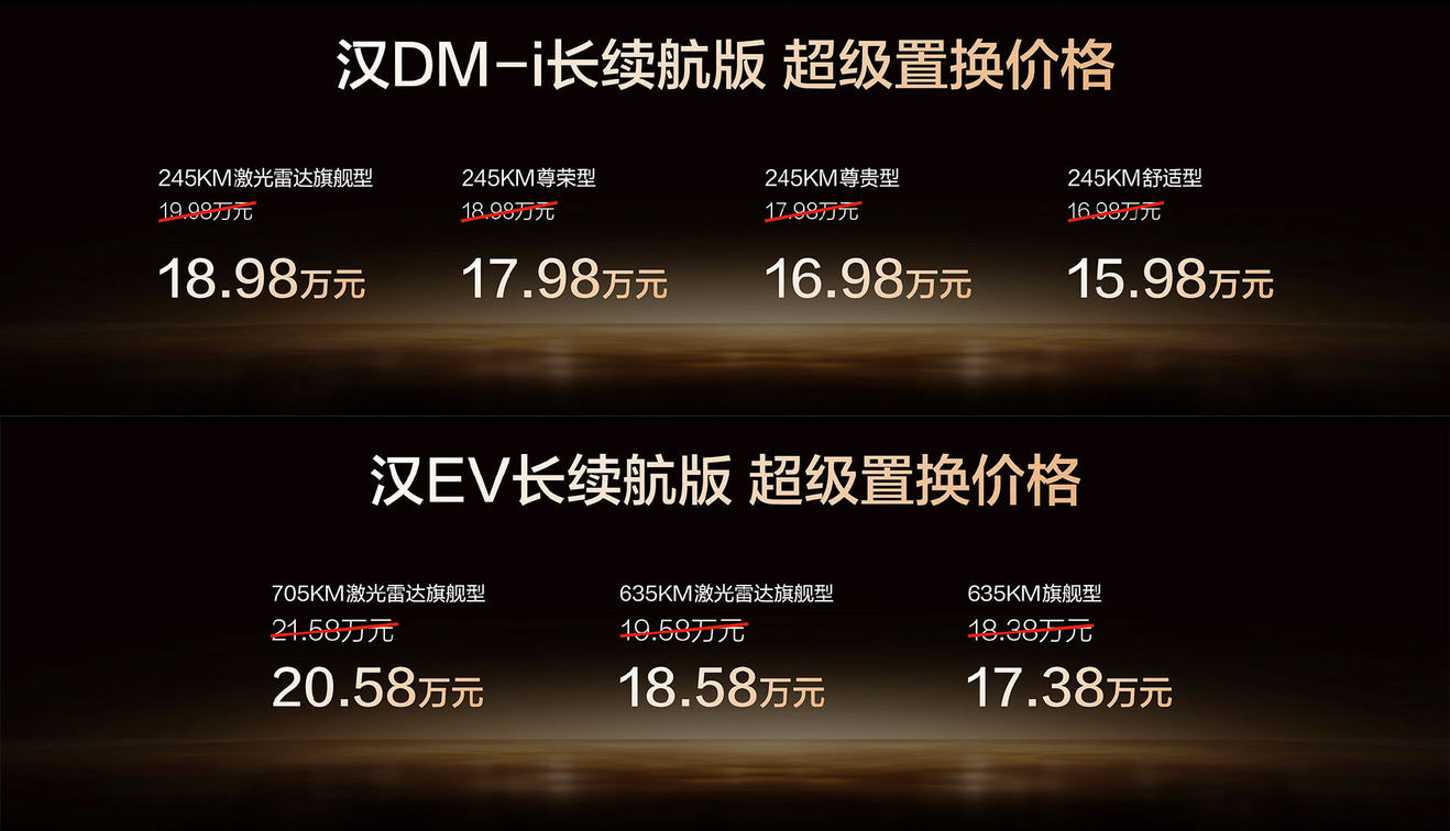 长续航版汉家族定价也很有诚意,10月底前买定离手还能享受1万超级置换补贴,因此汉DM-i的超级置换补贴售价区间就成了15.98-18.98万元,而汉EV的超级置换补贴价格区间就成了17.38-20.58万元,如果您还能拿到“报废焕新国补”呢!您说说是不是想想都觉得很高兴、很超值?