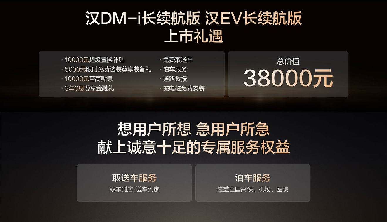 另外,服务方面的提升比亚迪近年来也是动作不断,比如汉车主免费尊享取送车服务、免费尊享泊车服务,而且免费泊车服务已经覆盖高铁站/机场/医院三大场景。