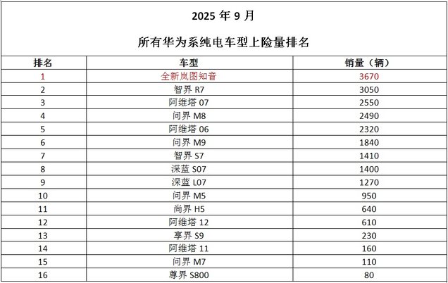 【2025年10月13日,武汉】据中国银行保险监督管理委员会上险量数据统计,刚刚完成上市仅1个月的全新岚图知音展现出了强劲市场爆发力,2025年9月以3670辆的终端上险数据,成功问鼎所有华为系纯电车型销量冠军,实力超越智界R7(3050辆)、阿维塔07(2550辆)、问界M8(2490辆)等一众华为系热销车型,成为名副其实的华系纯电销冠。