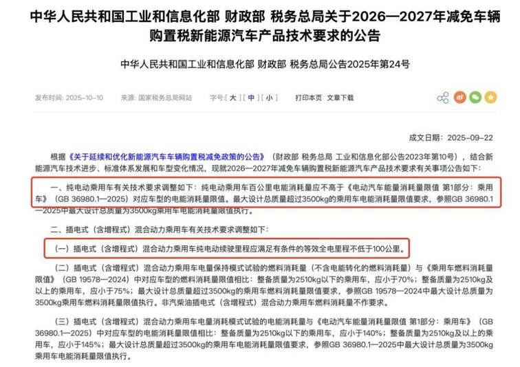 另外,前几天上头还发了新的公告,对2026—2027年减免车辆购置税的新能源车也做出了技术要求,核心就两条: