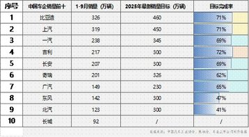 从销量前十车企的竞争格局来看,比亚迪与上汽集团共同占据第一梯队位置,1-9 月累计销量均突破 300 万辆。其中,比亚迪以 326 万辆的累计销量稳居行业榜首,已顺利完成其全年 460 万辆最新销量目标的 71%,凭借在新能源领域的技术优势与产品矩阵,持续巩固行业领先地位。上汽集团同期累计销量达 319万辆,全年目标完成率同样为 71%,在燃油车市场稳步推进、新能源车型加速布局的“双线并行”策略下,保持了稳健的增长节奏。