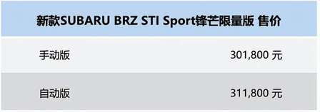 10月15日,新款SUBARU BRZ STI Sport锋芒限量版在中国市场正式发布。该系列将推出手动版和自动版两个版本,新车使用了特别的内饰外观,以100台限量销售的形式全新登场。手动版售价30.18万元,自动版售价31.18万元。新车预计10月末开始陆续交付。