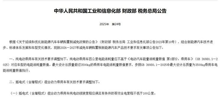 10月9日,工信部等三部门联合发布公告,明确自2026年1月1日起,插电混动车型享受购置税减免的纯电续航门槛从43公里提升至100公里。