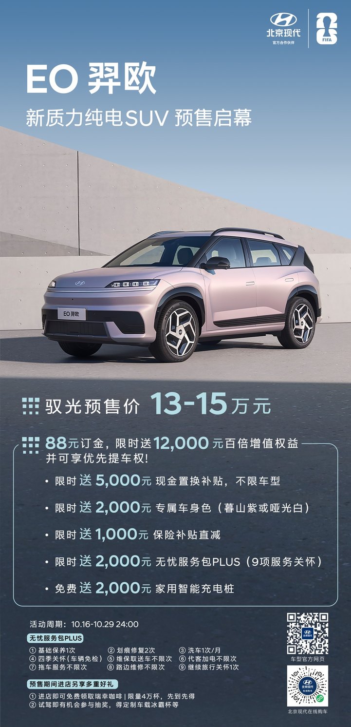 2025年10月16日,北京现代首款纯电平台SUV——EO羿欧正式开启预售,预售价格:13–15万元。