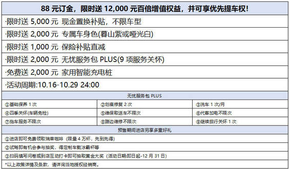 伴随预售价的发布,北京现代也同步推出了EO羿欧极具诚意的限时权益:支付88元订金,限时送12,000元百倍增值权益,并享优先提车权。