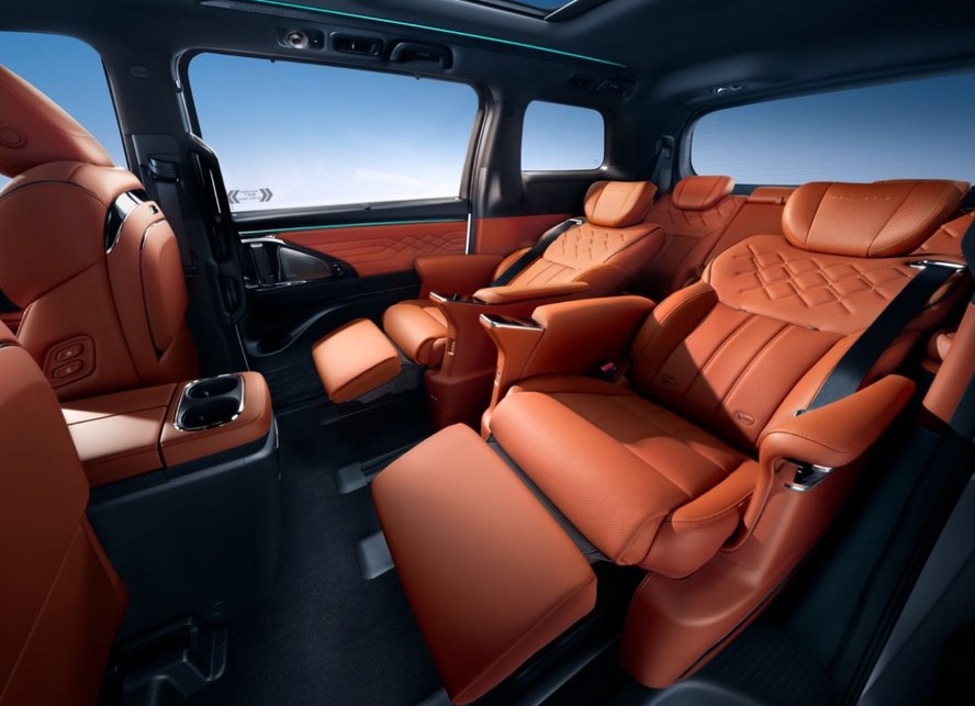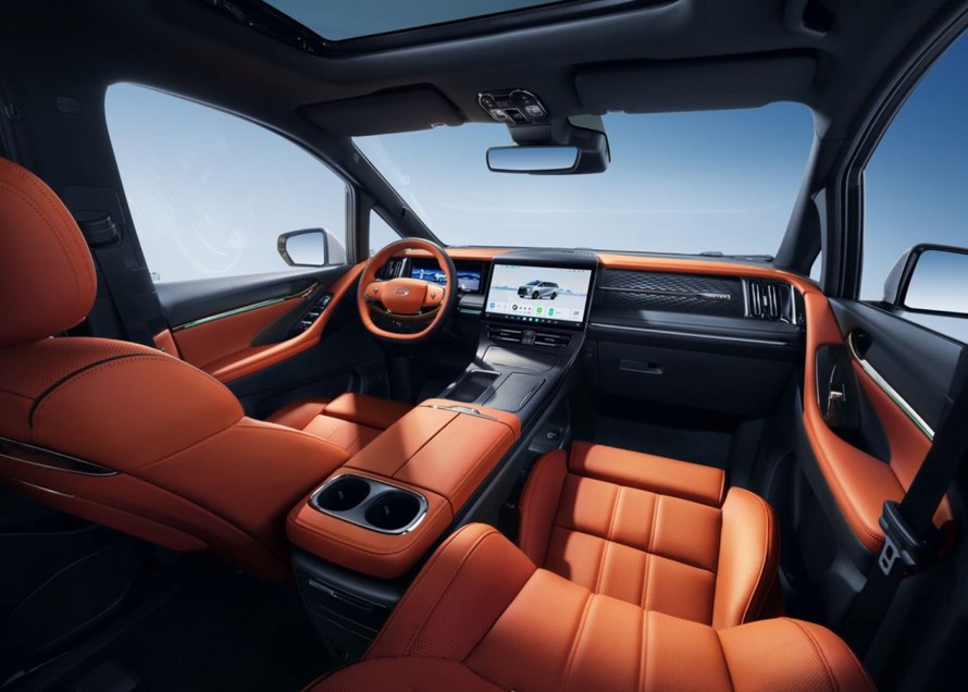 内饰部分,向往M8宗师版采用了环抱式座舱设计,搭配12.3英寸的内嵌式液晶仪表与15.6英寸的悬浮式中控屏,辅以镀铬饰条的点缀,展现出强烈的高级感。中控台的“横两纵”设计充分整合了翻盖储物格、无线充电面板和双杯架,兼顾了美观与实用性。在舒适性配置上,新车配备了双天窗、二排小桌板和物理遮阳帘等实用设施,全系标配双侧电动侧滑门与电动尾门,并使用隔音玻璃与隐私玻璃,进一步提升了后排乘客的舒适体验。座椅布局继续采用2+2+3的七座形式,第二排独立座椅配备了触控面板,方便乘客调节座椅功能。