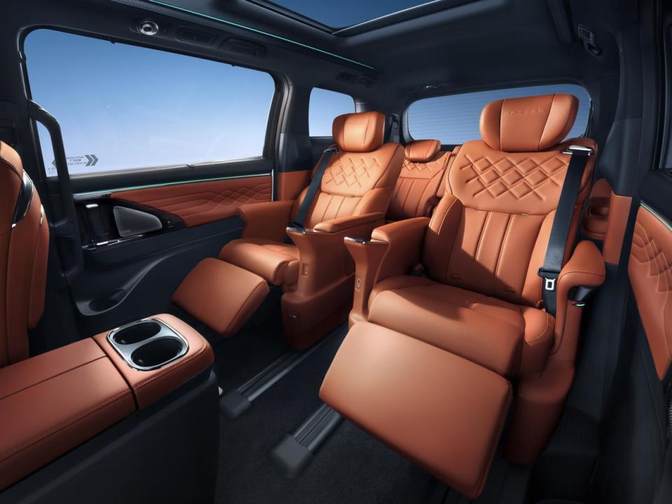 在舒适性方面,传祺向往M8宗师对座椅和空间进行了优化。第一排配备五星SPA按摩座椅,采用16点三层气袋式按摩设计,坐垫可伸缩至570mm,副驾支持“女王躺”坐姿;第二排为五星SPA双零重力座椅,靠背最大可调角度166°,搭配16点五星SPA按摩与雅马哈头枕音响,同时配备一体式扶手、5英寸液晶控制屏、皮质小桌板、220V电源插座及二排遮阳帘;第三排采用加高加厚坐垫,靠背支持四挡调节,最大倾斜角135°,搭配四挡调节水平扶手。空间布局上,第三排拥有220mm超长滑轨,支持4/6比例放倒,可实现4/5/6/7人乘坐布局,三排翻折后行李厢空间达1500L,最多可容纳19个20寸行李箱。此外,车辆还配备全球首创的无风感空调系统,通过1600余个微孔调节温度;全软包覆分段式拉手长达60cm,最低处离地86cm,方便儿童上下车。