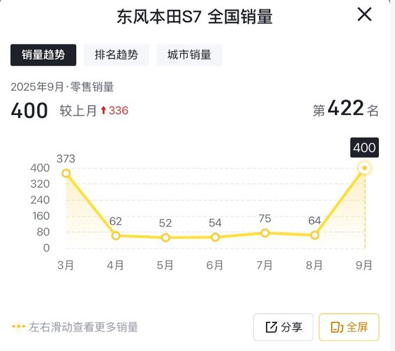 第三方平台公布的行业综合销量数据显示,2025年3-9月份,本田S7的单月零售销量分别为373台、62台、52台、54台、75台、64台、400台。
