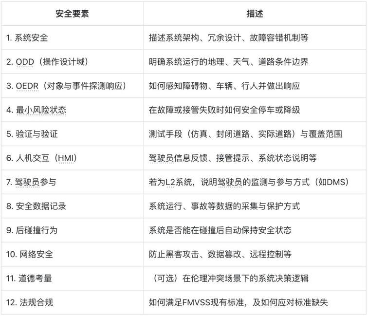 针对L2级别的辅助驾驶系统,美国没有正式的法规。NHTSA在2017年发布了VSSA(Voluntary Safety Self-Assessment),它是一份系统制造商自愿提交的公开报告,用于向公众和监管机构展示系统在各个安全方面的考量和设计措施,但是并不是强制要求的认证文件,企业是否提交并不会影响系统或者车辆的上市许可,报告中披露的内容由企业自行决定。