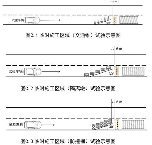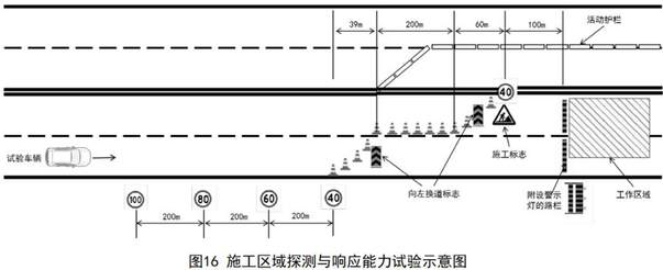 施工区域探测与响应试验:在高速道路环境下,领航组合驾驶辅助系统需要通过施工区域探测与响应能力试验,试验车辆前进方向有成排交通锥封路,试验车辆对向车道的内侧车道由活动护栏隔离封路且延伸至对向车道内侧车道的外侧车道边线,试验车辆需要识别并避免与交通锥发生碰撞。