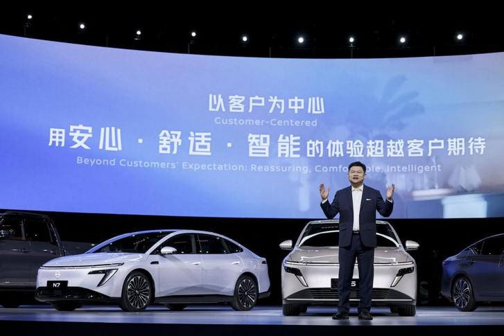 车型亮相,从左至右:Frontier Pro PHEV、N7、N6、天籁·鸿蒙座舱、Frontier Pro