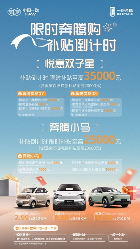 就在近期,一汽奔腾推出了极具诚意的秋季限时补贴政策:截至10月底,入手奔腾小马即可享受至高25000元的综合补贴,其中包括国家以旧换新补贴至高20000元,再加上限时颜色焕新、无门槛焕新补贴、金融贴息等多重礼遇。折算下来,这台纯电精品小车的入门价格直接拉低至2.99万元起,配合全系222km的续航里程,让不少观望中的年轻用户直呼“真香”。