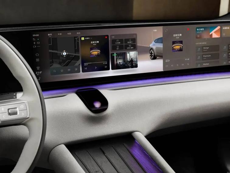 坐进车内,两款车的差异更加明显。E5 Sportback配备了59英寸贯穿式大屏(包括12.3英寸液晶仪表、27英寸中控屏及双7英寸电子外后视镜屏)。车内采用结构化建筑美学,将天然实木材质与舒适科技有机融合,与特斯拉Model 3那种极简至被笑称“毛坯”的内饰风格形成了鲜明对比。