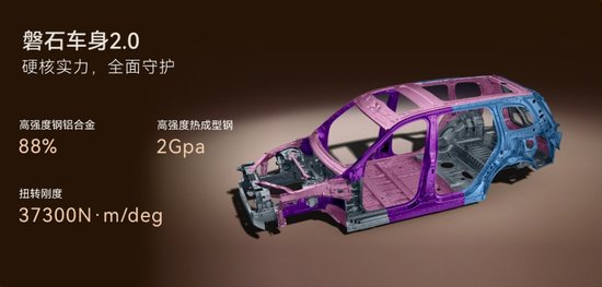来看“硬骨架”方面,整车采用磐石车身2.0方案,高强度钢铝合金占比88%,关键承压部位热成型钢强度达2Gpa,整车扭转刚度高达37300N·m/deg,这在同级中属于最高水平,让整车具有极强的抗形变能力。