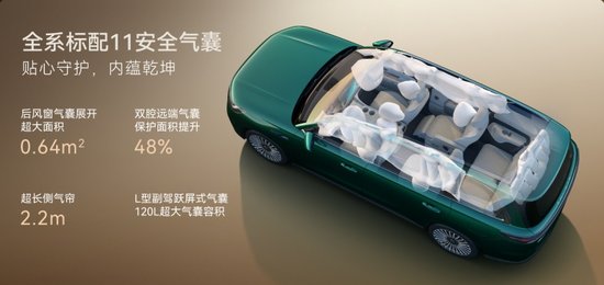 气囊配置同样亮眼,全系标配11个安全气囊,其中包括后风窗安全气囊,这样的配置在中国SUV品类量产车型中十分罕见。0.64m²的展开面积,再加上2200mm超长侧气帘,能填补第三排防护空白,形成一到三排“软缓冲”的全面防护。