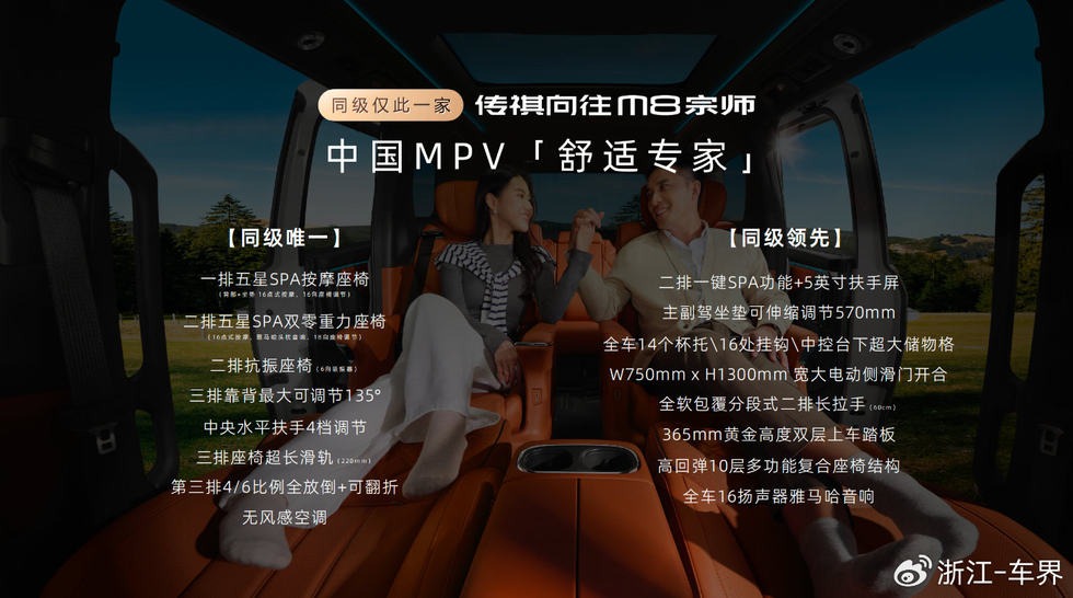 向往M8宗师让第一排不再是“司机专座”,更将第二排座椅舒适提升至全新高度。同级唯一的五星SPA双零重力座椅,靠背最大可调角度达到166°,实现接近躺平的放松效果,再叠加16点五星SPA按摩与雅马哈头枕音响,形成集听觉、触觉于一体的星级酒店式休憩空间。同时,宽大的一体式扶手、5英寸液晶控制屏、皮质小桌板、220V电源插座及二排遮阳帘等豪华便捷配置,兼顾商务办公与家庭娱乐所需。