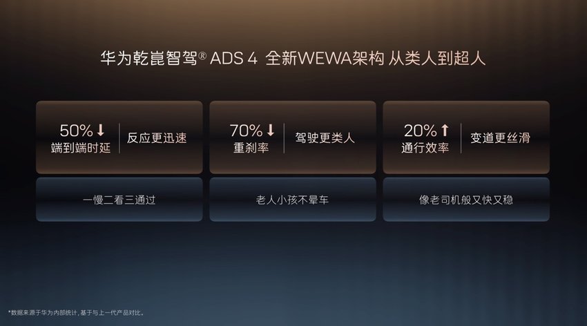 先看智能安全。新车全系标配华为四激光雷达系统,在原有3颗长距激光雷达基础上,新增1颗后向高精度固态激光雷达,实现360°无死角感知。这不是简单的“堆硬件”,而是真正解决了传统视觉方案的痛点——比如在昏暗地下车库倒车时,能精准识别悬空消防栓、下沉台阶这类“视觉盲区”,及时警示并刹停;夜间或逆光场景下,对异形障碍物的识别也更可靠。搭配华为乾崑ADS 4,通行效率提升20%、重刹率降低30%,连“鬼探头”都能实现微秒级响应,这种“超越人类驾驶”的安全冗余,对有家庭的用户来说,比花哨的内饰更有吸引力。