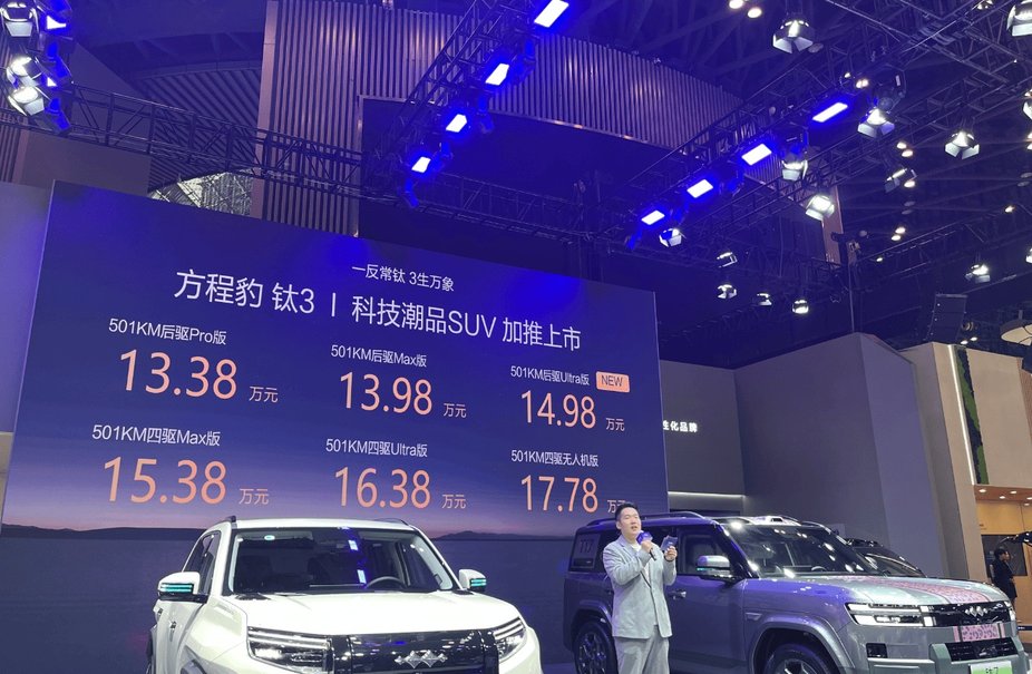 发布会现场,方程豹公布双车售价:钛7推出4个版本,售价17.98万元(135KM两驱Pro版)、18.98万元(200KM两驱Max版)、20.68万元(190KM四驱Max版)、21.98万元(190KM四驱Ultra版);钛3加推版14.98万元起售。