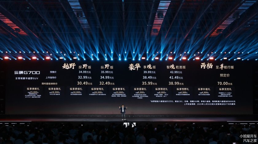 2025年10月19日,以“至 前所未至”为主题的纵横G700全球上市发布会在安徽芜湖宜居国际博览中心落下帷幕,作为纵横旗下首款量产车型,新车定位“全领域豪华越野SUV”,共推出4个版型,官方指导价为32.99万元—41.49万元,限时超级焕新价30.49万元起,并带来十大上市专属购车权益,旨在为用户提供从购车、用车到玩车的全链路尊享体验。作为纵横首张成绩单,G700的横空出世,正是纵横以技术创新打破边界,以品类创新定义豪华,以场景创新重塑价值的集中体现。而纵横更是以G700的全领域实力,成就中国汽车工业从大变强的新里程碑,引领属于中国、面向全球的豪华越野新时代。