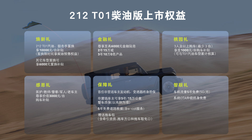 从212到二一二,隶属于新时代的T01终于在柴油版车型上市后,让越野情怀再次满血。新车指导价16.59万元,针对新老用户定制了六大上市权益 ,从购车优惠到用车保障,涵盖了车辆的全生命周期。