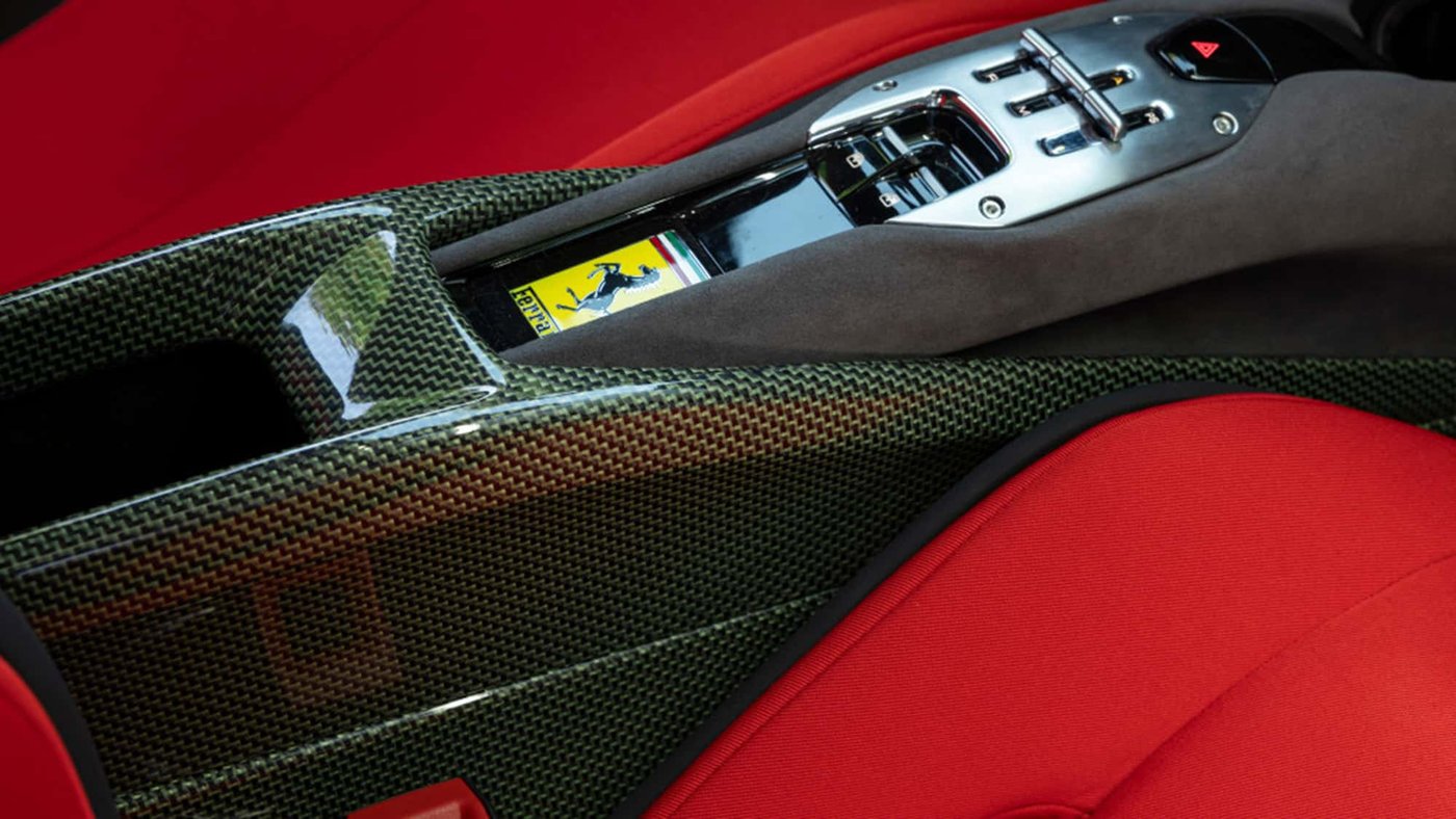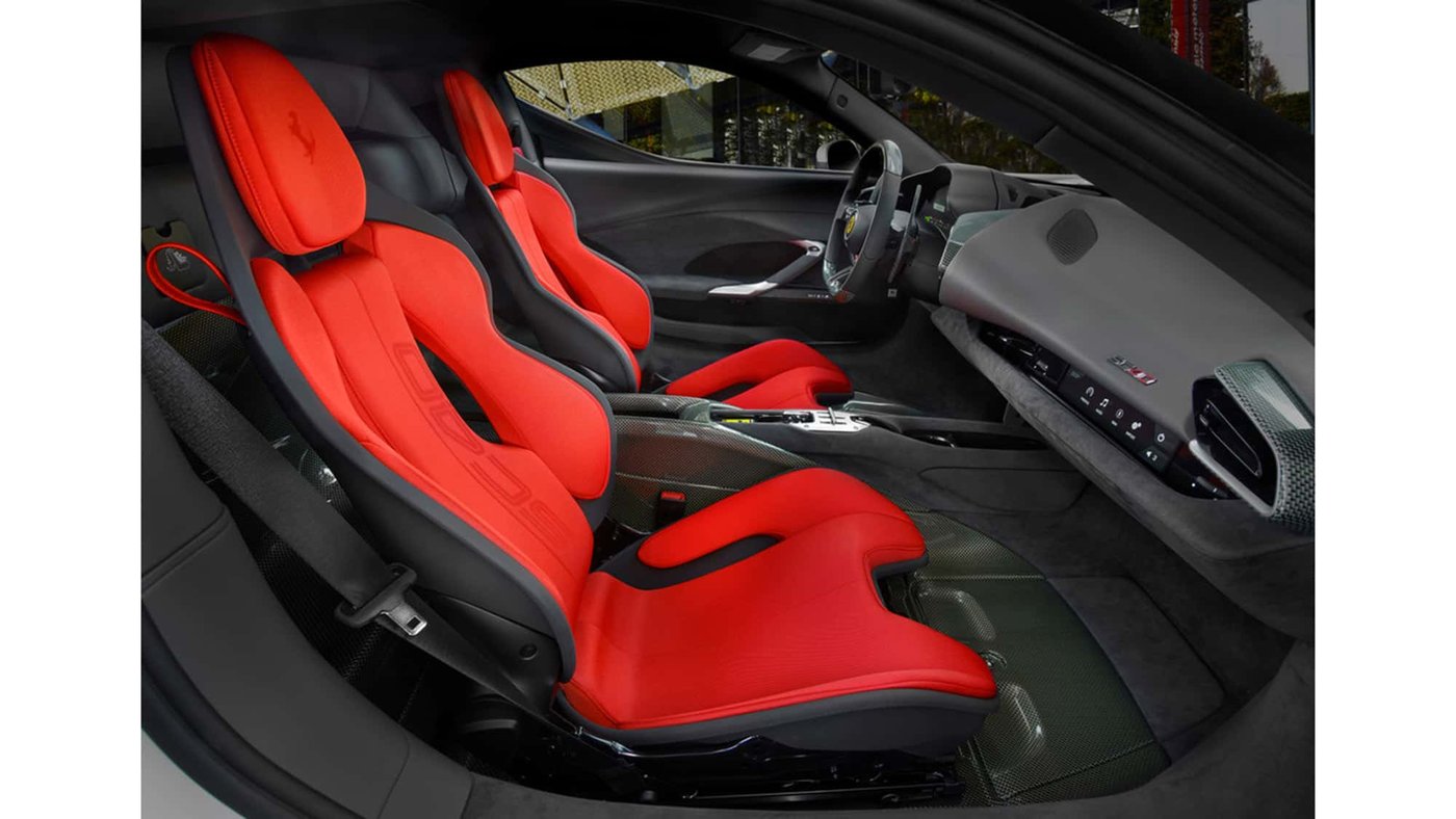 在座舱内部,SC40延续并再现了F40的材料“哲学”。经过改良的碳纤维-凯夫拉(Carbon-Kevlar)材料应用于座椅背后、地垫部分、方向盘以及部分仪表组件。深灰色Alcantara与红色提花科技面料(Jacquard Technofabric)形成对比,座椅头枕上绣有编织的SC40标志与跃马徽标。