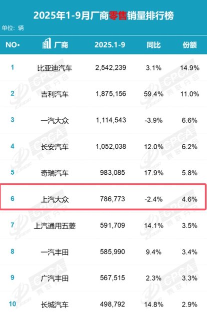 事实上,从1-9月份累计销量来看,上汽大众同样呈现出下滑的态势。乘联会数据显示,2025年1-9月份,上汽大众的累计零售销量为786773台,同比下滑2.4%。