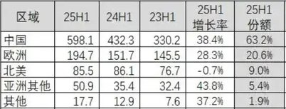 2025年上半年全球新能源汽车销量约946.9万辆,同比增长31.8%。其中中国市场增长率为38.4%,市场份额63.2%。