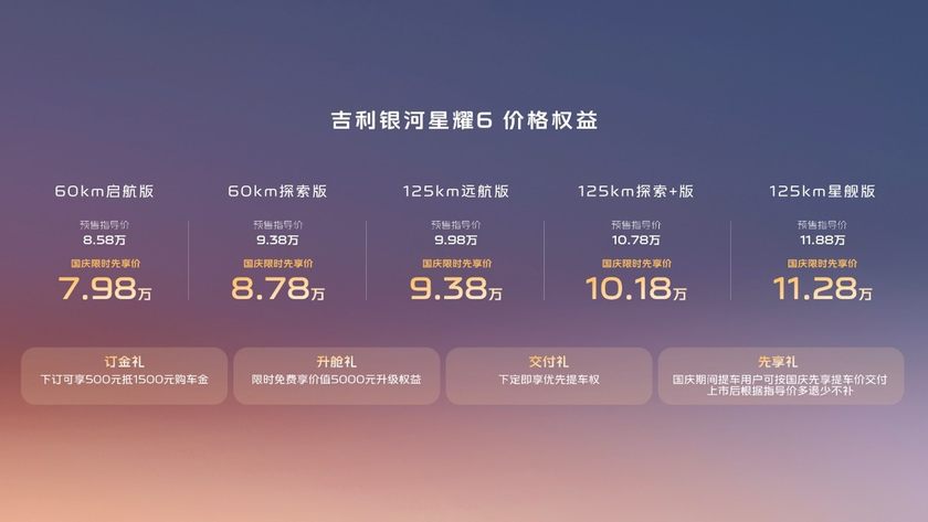 吉利银河星耀6基于GEA全球智能新能源架构打造,得益于行业领先的电混技术,不仅亏电油耗达到同级最低的2.8L/100km,还通过专属动力标定带来了出色驾控体验,实现了低油耗与操控感的完美平衡。新车共推出60km启航版、60km探索版、125km远航版、125km探索+版、125km星舰版5个版型,官方预售价为8.58万元-11.88万元。