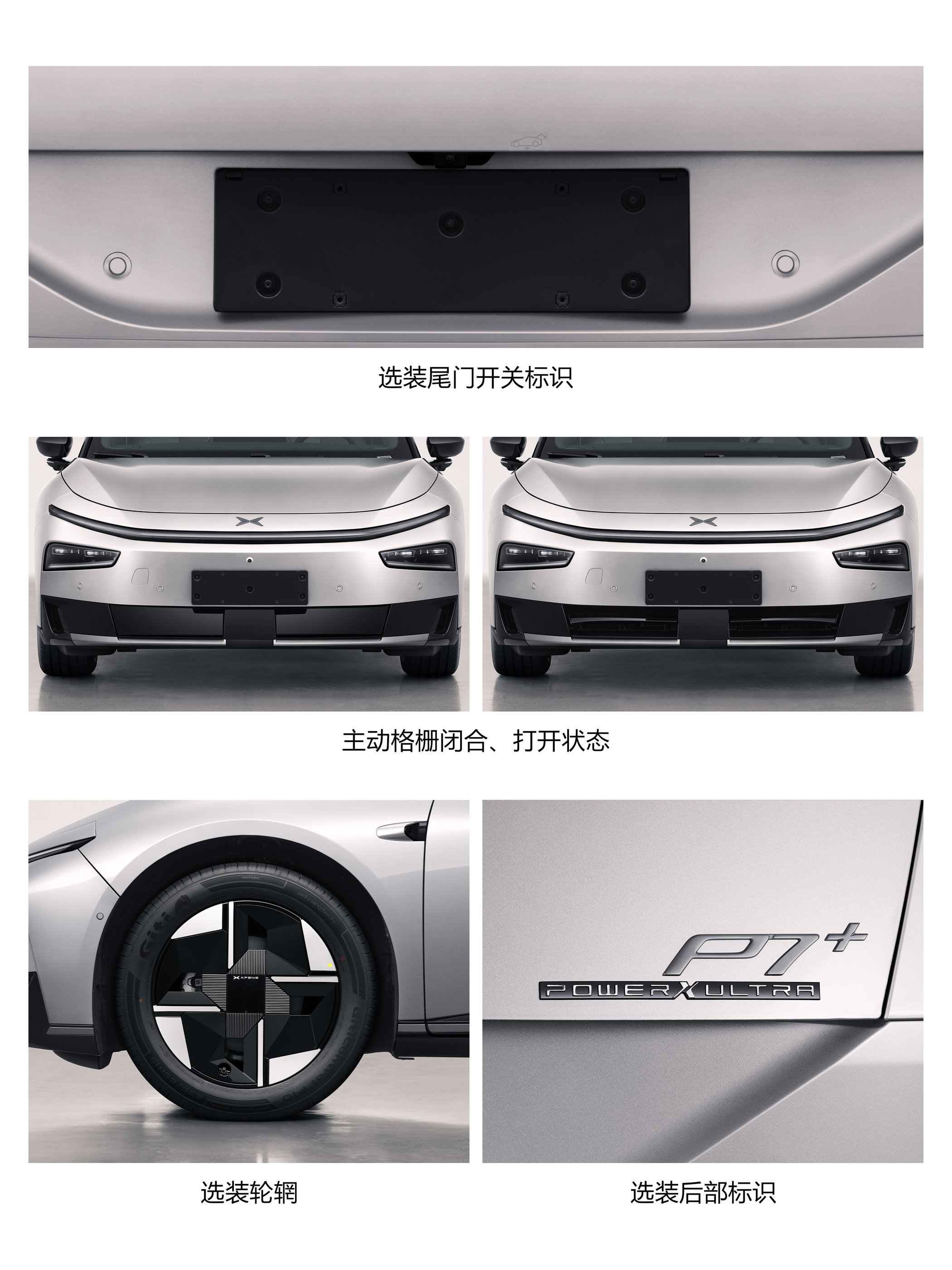 外观部分,小鹏P7+增程版延续了纯电版的整体造型,但在前脸和尾部细节上进行了针对性调整:前包围下部取消了纯电版的黑色饰条,换装为具备主动调节功能的通风格栅,以提升散热效率;尾部新增“POWER ULTRA”标识。此外,新车提供19英寸与20英寸两种全新样式轮毂。车身长度也较纯电版增加15mm,不过这一变化主要来自增程系统硬件。