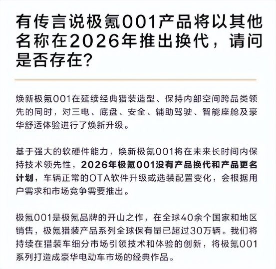 10月15日,极氪在《焕新极氪001答用户问(第3期)》中,针对传言给出了毫不含糊的答案:“2026年极氪001没有产品换代和产品更名计划。”