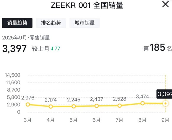 再看销量,根据第三方数据显示,2025年1-9月,极氪001单月零售销量在2174台到4359台之间,9月销量3397台。但作为极氪的“开山之作”,在全球40多个国家和地区销售,猎装系列全球保有量超30万辆,由此可见极氪001在国内汽车市场的销量还有很大的发展空间。